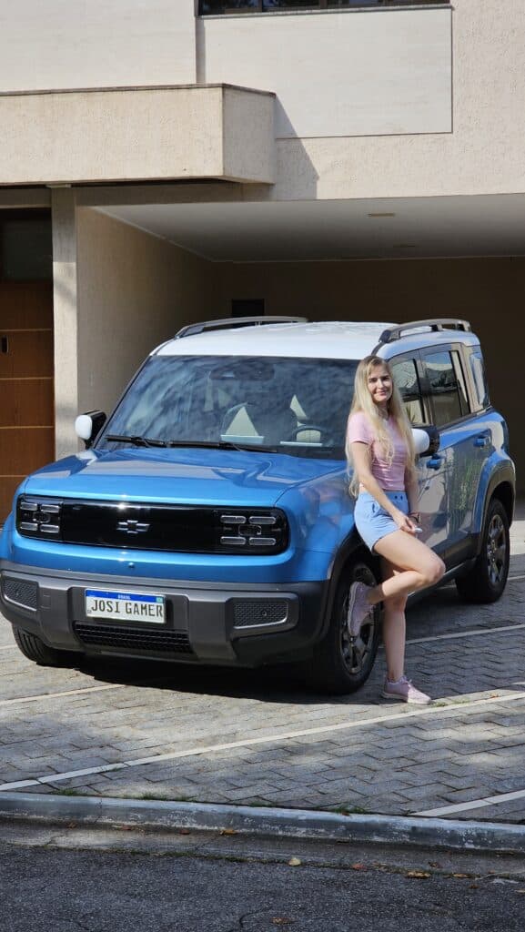 Logo de cara, ele já mostra que não quer ser “mais um”. O ponto de carregamento fica na parte da frente, algo prático no dia a dia e que dá aquele ar moderno. E sim, ele carrega pela frente, detalhe que facilita muito quando você estaciona de frente para o wallbox.